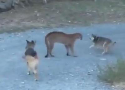 تلاش دو سگ نگهبان برای فراری دادن شیر کوهی