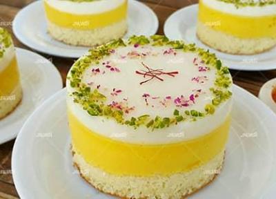 طرز تهیه چیزکیک زعفرانی 3 لایه با کیک هل و گلاب