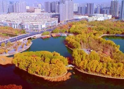 منظره ای زیبا از دریاچه لیکسیانگ ، که درختان با برگ های طلایی احاطه شده است.